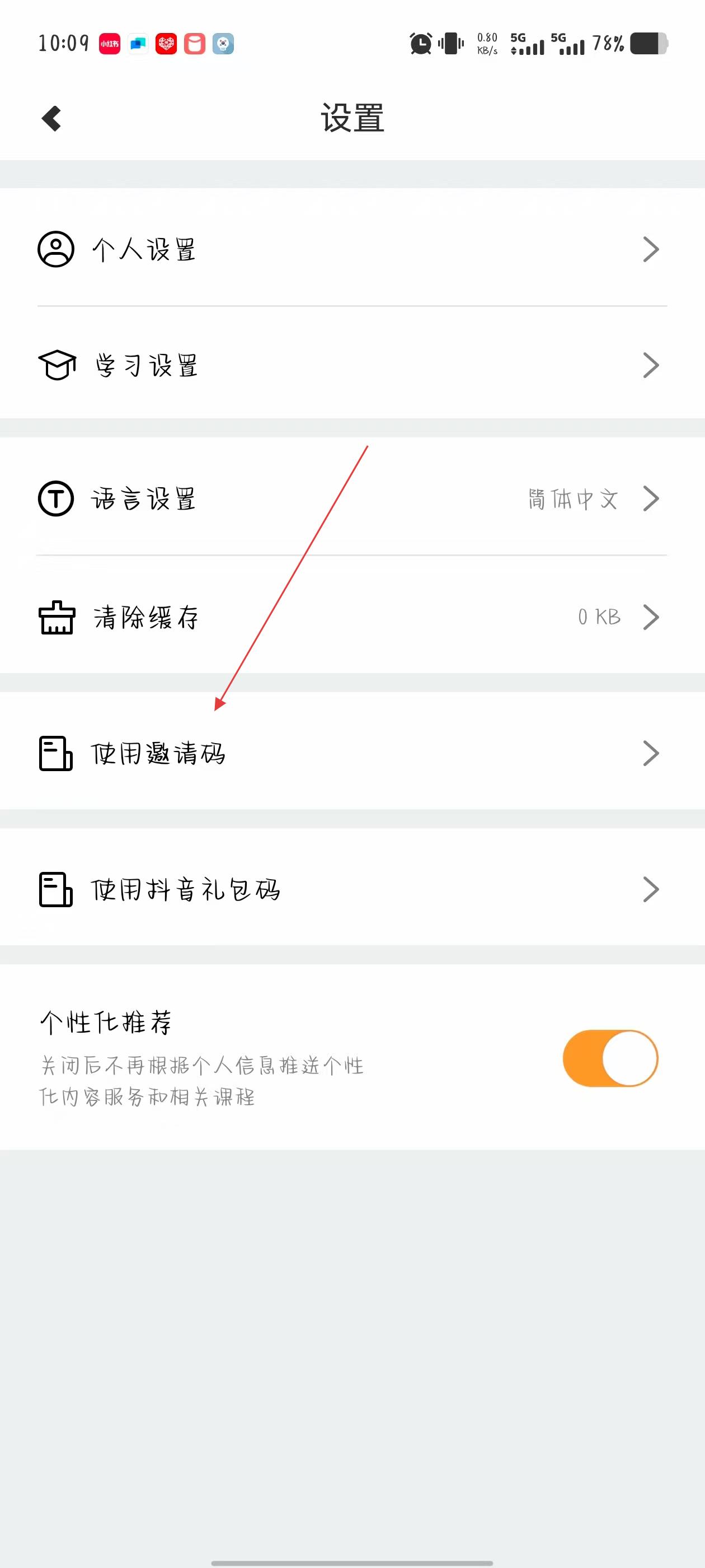 3、在设置界面里,找到使用邀请码选项并点击,进入邀请码输入页面。