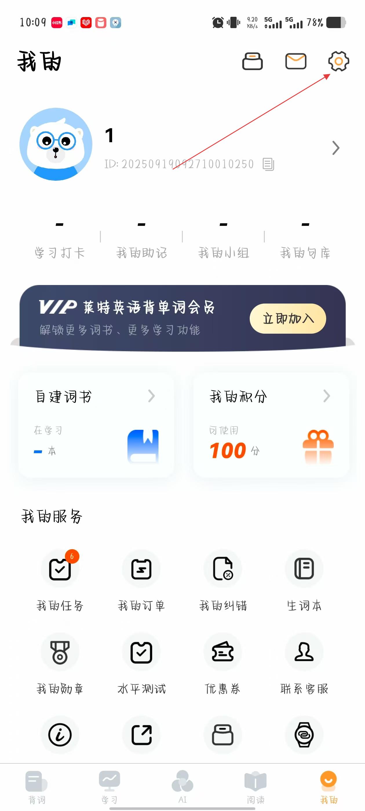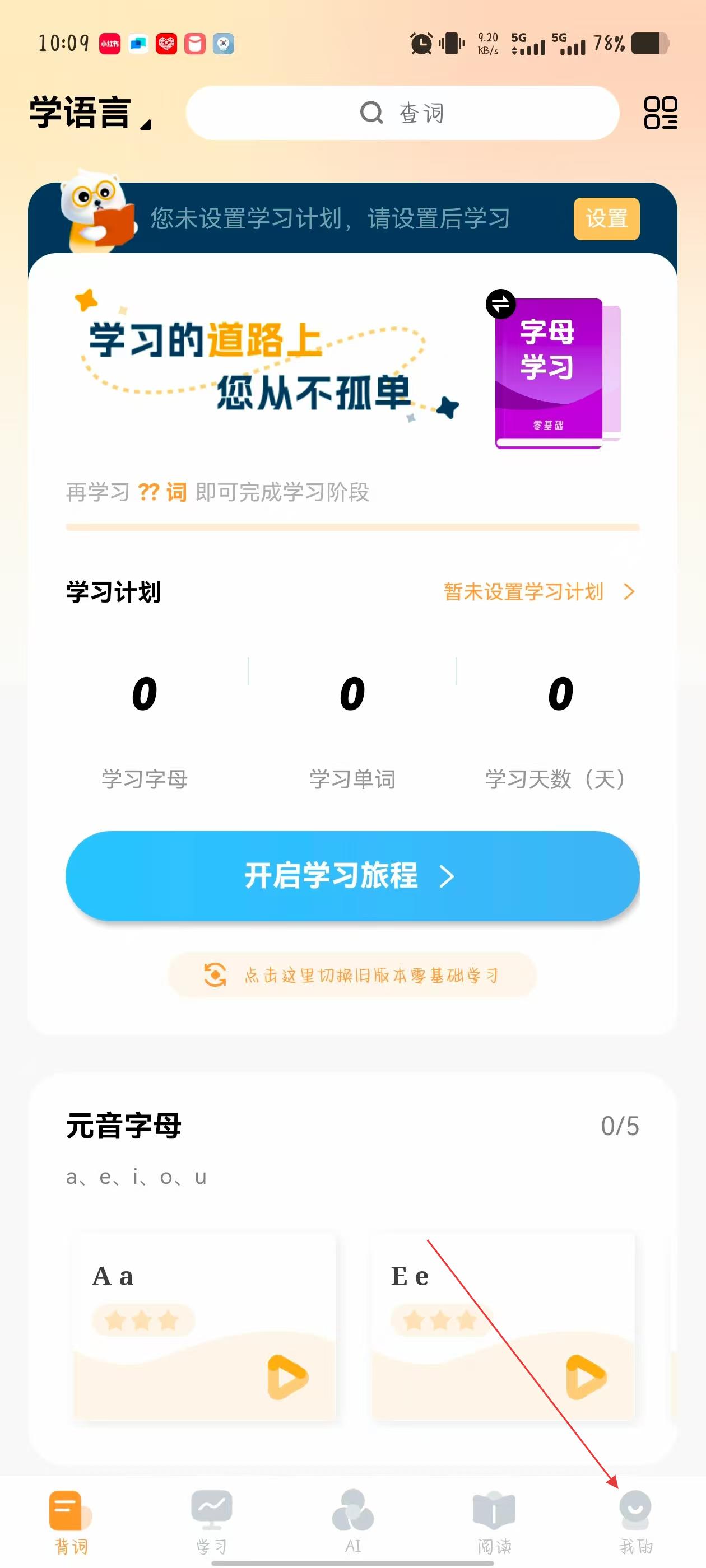 1、打开莱特英语背单词APP,点击底部导航栏最右侧的我的,进入个人页面。
