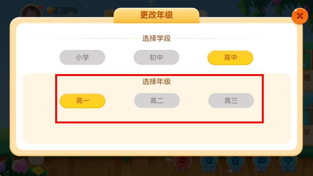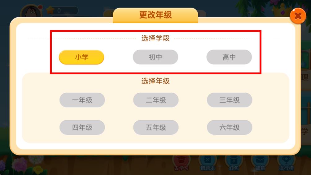 2、在更改年级界面的选择学段板块,根据需求点击小学、初中、或高中按钮,确定学段。