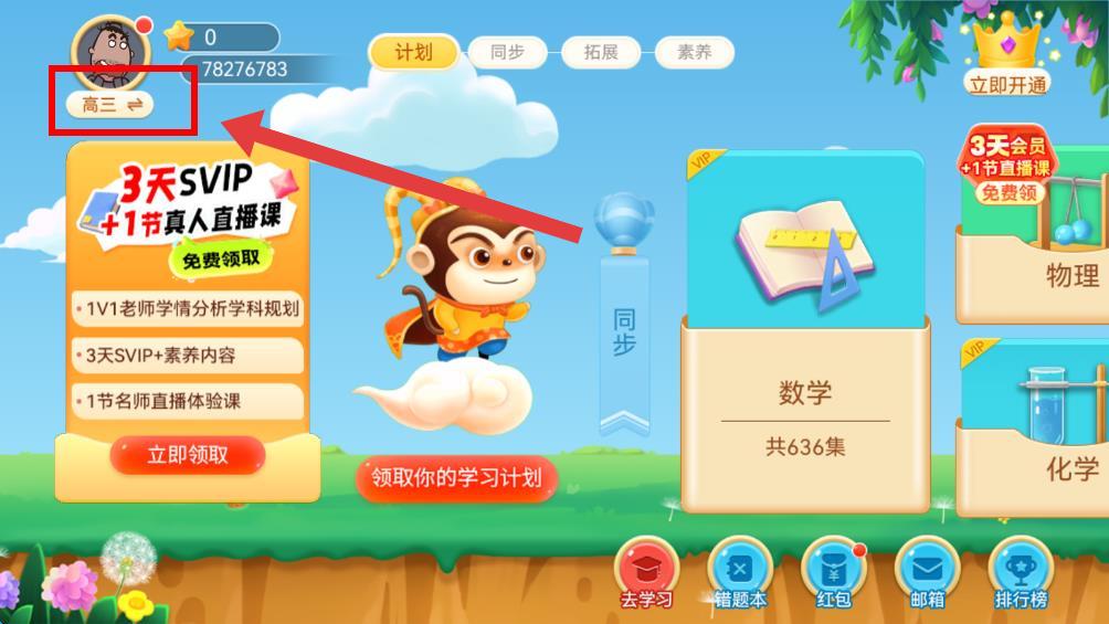 1、打开天天练app进入主界面后,点击左上角显示当前年级标识区域,进入更改年级界面。