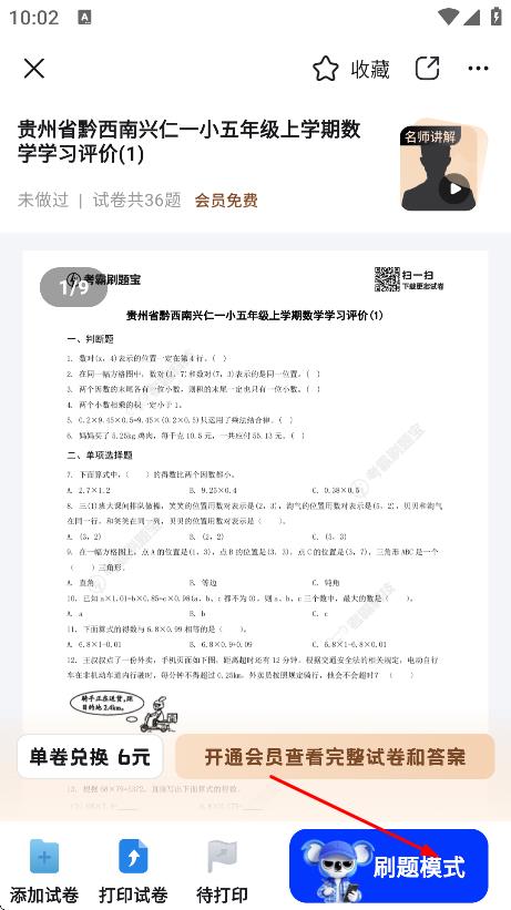 4、进入试卷页面后,点击刷题模式,可进入刷题模式做试卷。