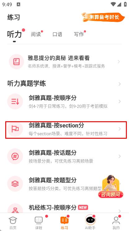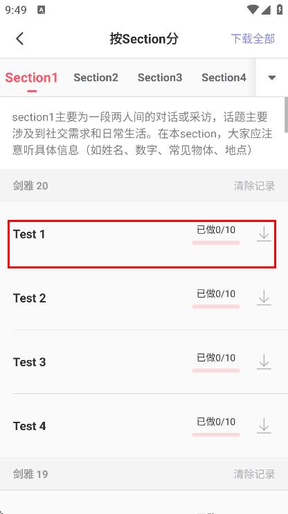 2、在练习页面,选择剑雅真题-按section分,进入按Section分的真题页面。