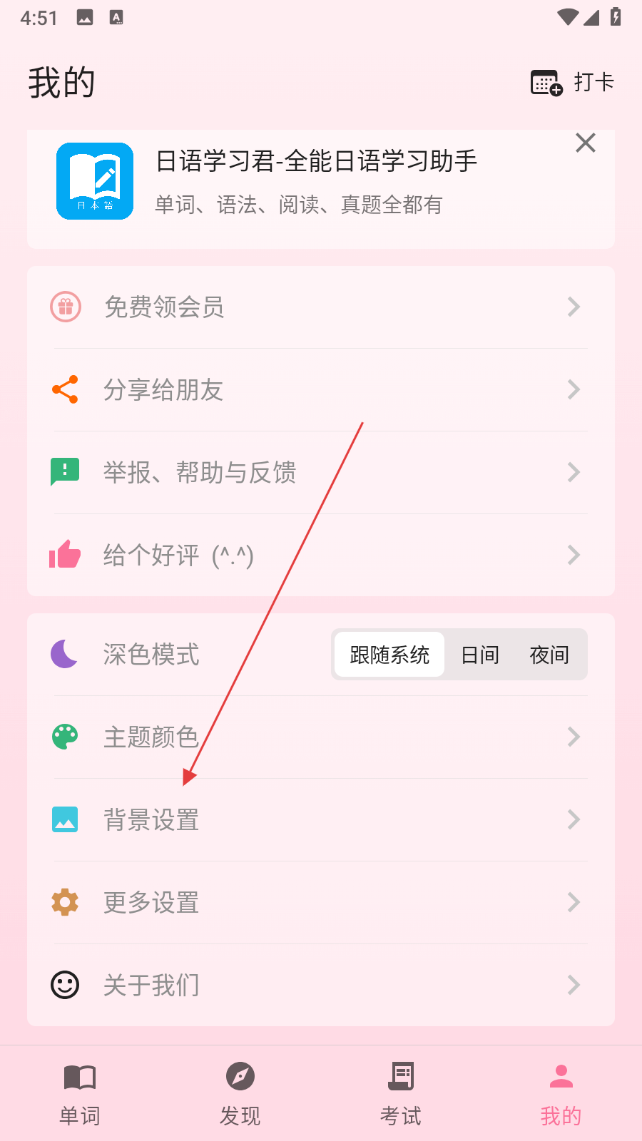 2、在我的页面中,找到并点击背景设置选项,进入背景设置界面。