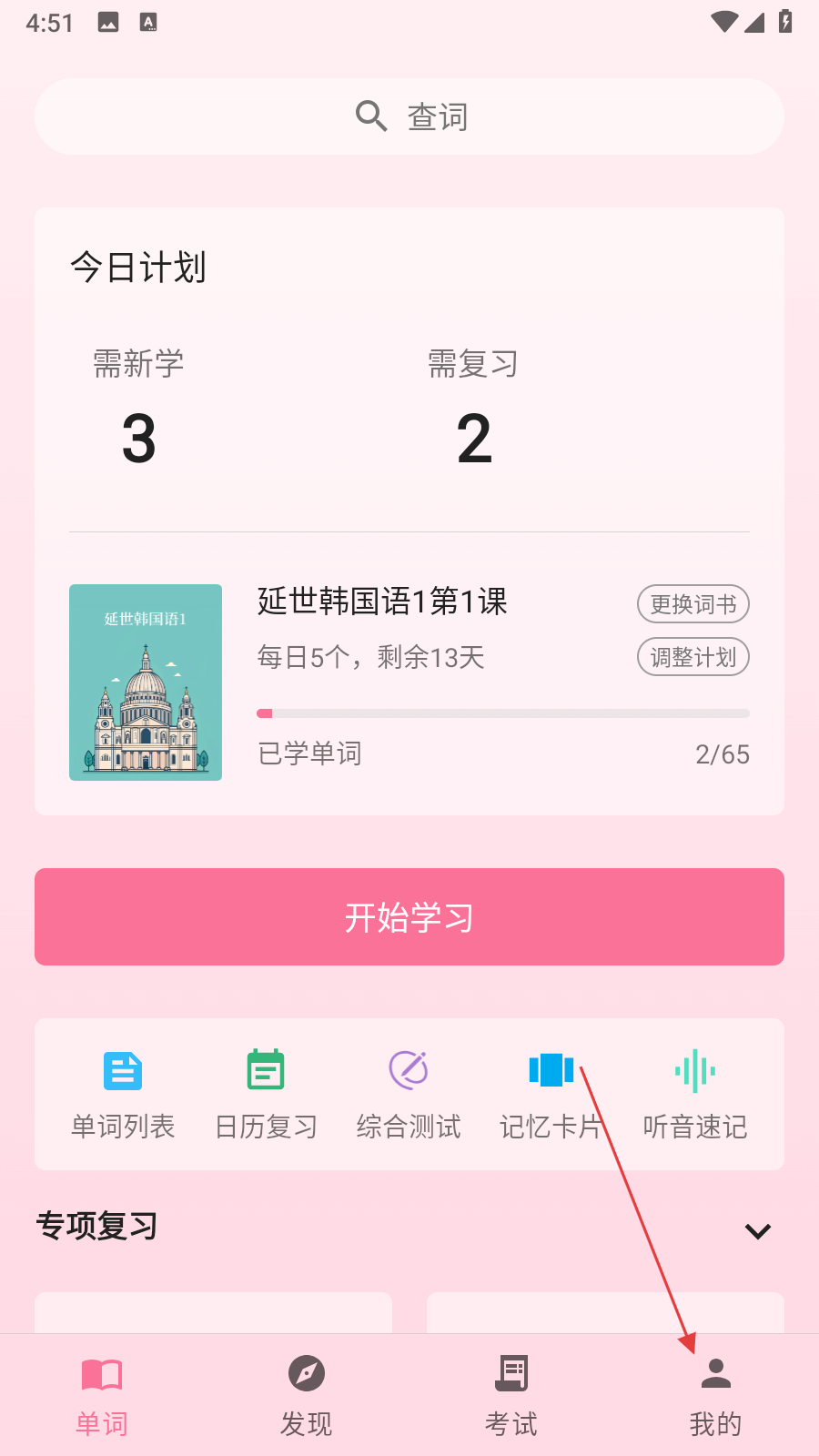 1、打开韩语学习君APP,点击底部导航栏最右侧的我的,进入个人中心页面。