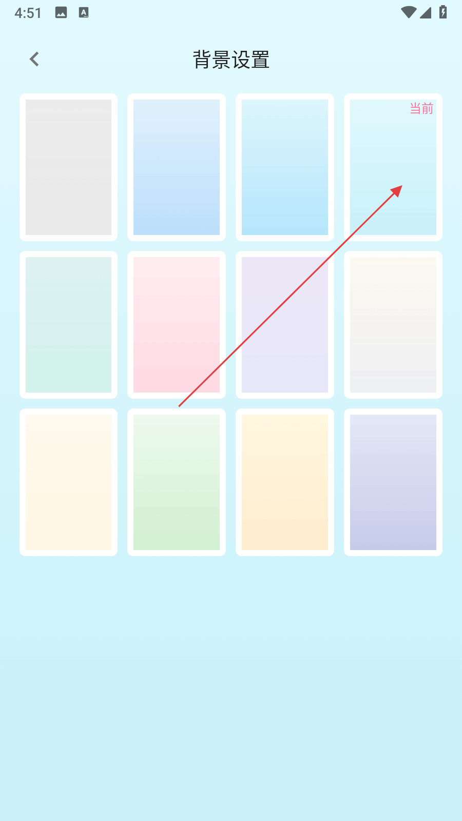 3、在背景设置界面,会展示多种颜色的背景选项,点击你想要更换的背景样式。