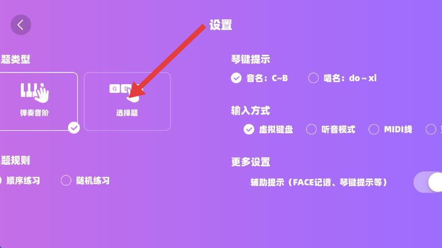 4、在设置页面的题类型板块,点击选择题选项,完成设置。