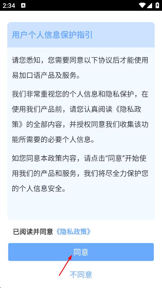 1、打开易加智能英语,在弹出的用户个人信息保护指引提示框中,点击“同意”,进入登录页面。