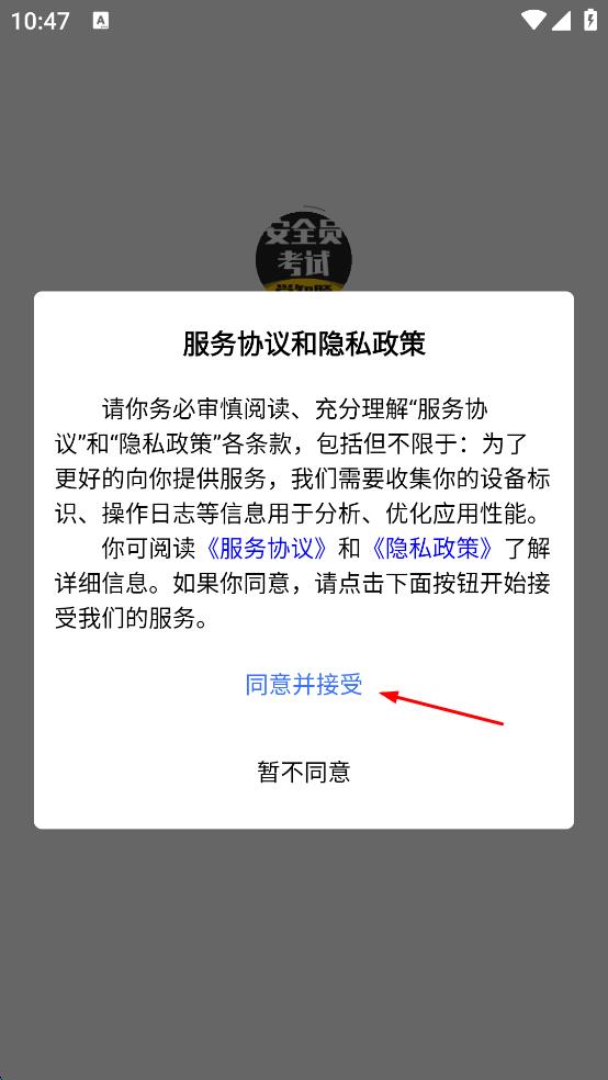1、打开安全考试APP,弹出“服务协议和隐私政策”窗口,仔细阅读相关内容后,点击“同意并接受”按钮,进入登录页面。