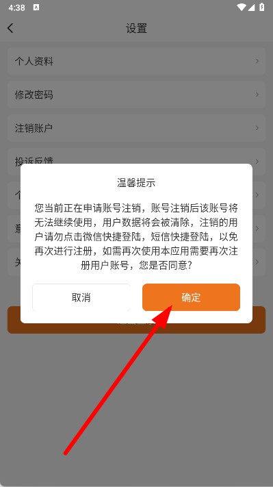 4、在温馨提示弹窗中点击确定,完成账号注销操作。