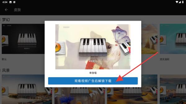3、若皮肤需观看广告解锁,点击弹出窗口中的观看视频广告后解锁下载按钮,看完广告后皮肤会自动应用到钢琴界面。