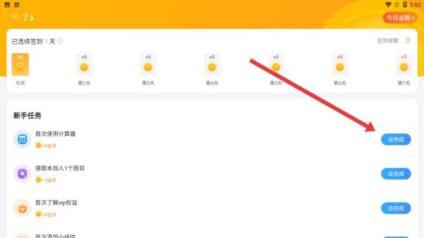 3、还可以在签到页面新手任务栏,针对首次使用计算器任务,点击右侧按钮,跳转至计算器模块,尝试工具推进任务进度。