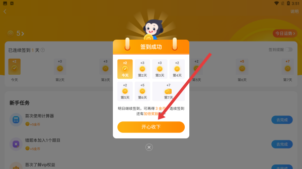 2、签到成功弹出提示框后,点击橙色开心收下按钮,领取当日签到奖励,完成奖励收取,继续后续学习互动。