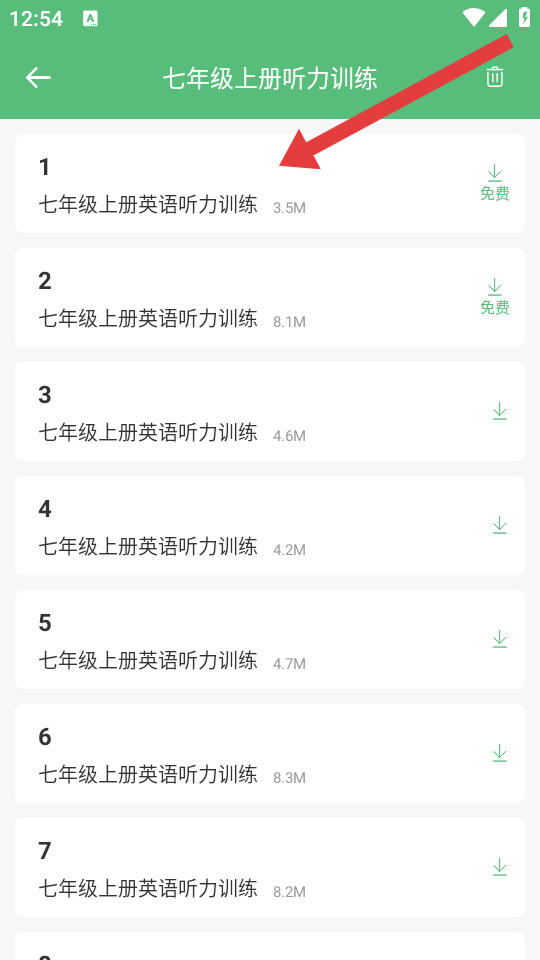 1、进入教材听力训练界面后,选择进入年级的听力练习列表页面。