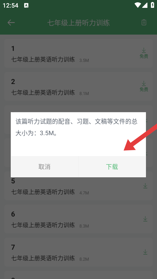 3、在操作界面,点击下载的按钮,可获取该篇听力试题的配音等文件。