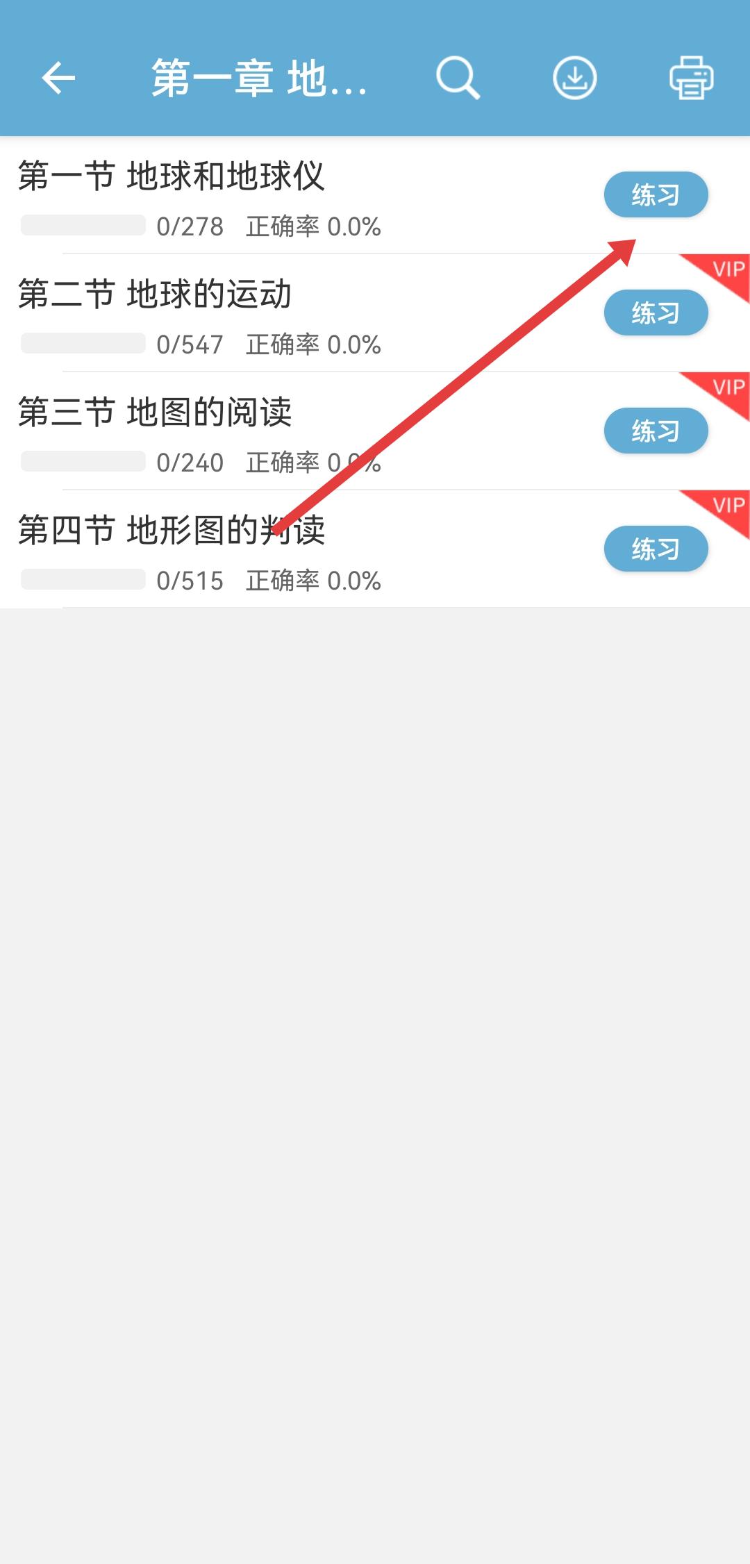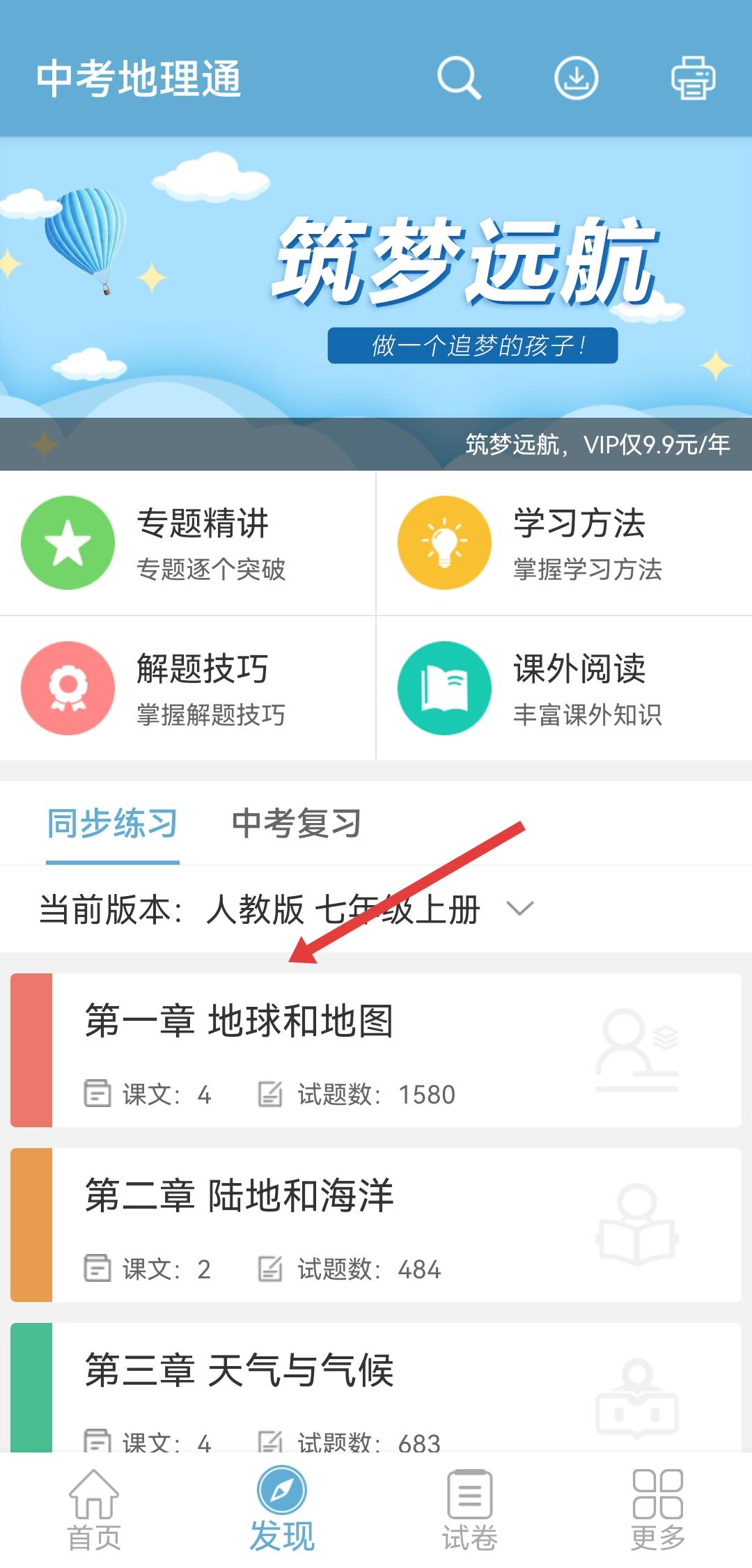 1、打开中考地理通APP,点击发现在同步练习区域选择要刷题的章节进入。