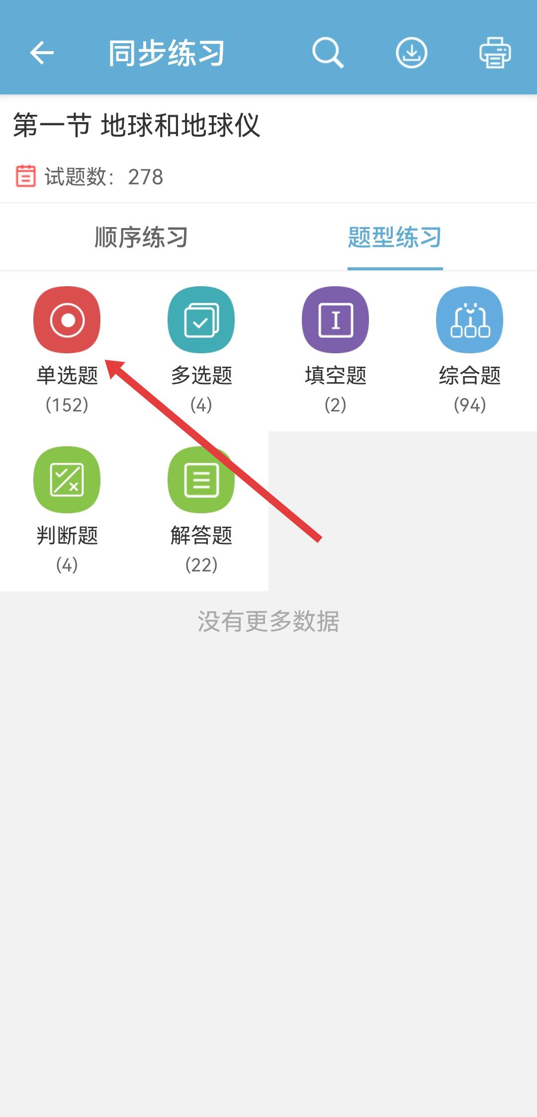 3、在同步练习页面,选择题型如单选题,点击进入题目练习界面。