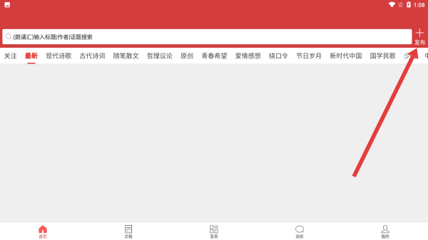 1、在朗诵汇首页中,可以点击右上方的发布按钮进行发布文章。