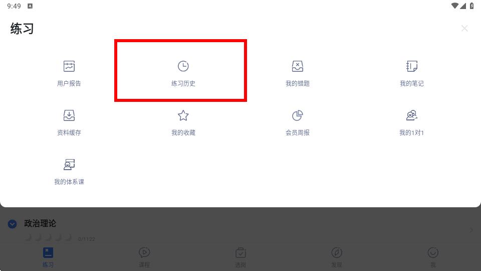 2、在更多功能页面中找到并点击练习历史选项,进入练习历史记录界面。