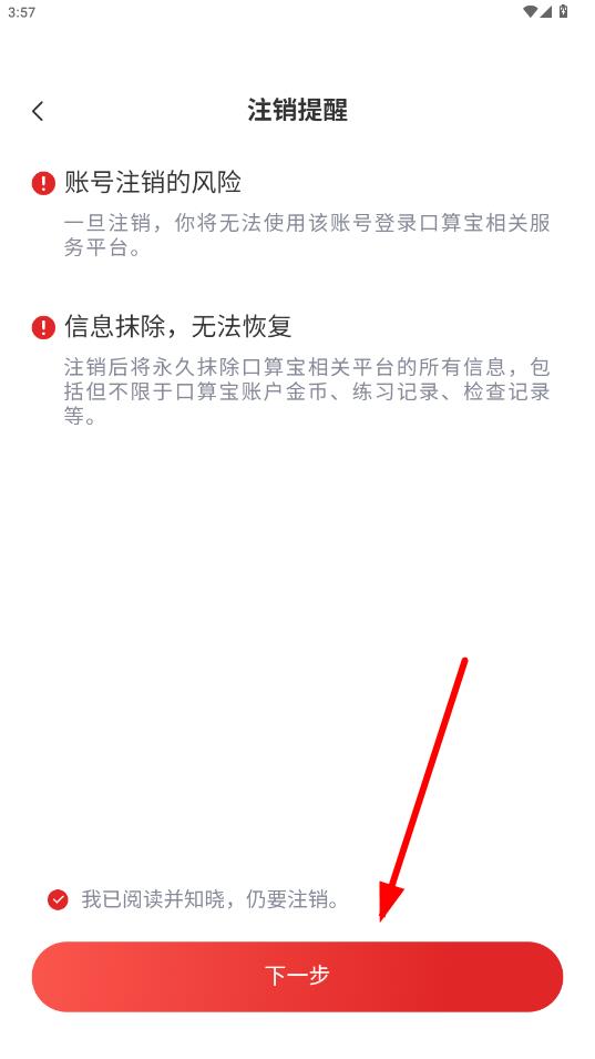 4、在注销提醒页面,勾选我已阅读并知晓,仍要注销,然后点击下一步按钮。