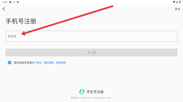 3、在手机号注册页面,输入手机号码,勾选用户协议、隐私政策及登录政策,激活下一步按钮准备注册。