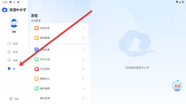 1、在智慧中小学平台界面,点击左侧导航栏的我,进入个人中心页面,查看游客状态下的功能列表。