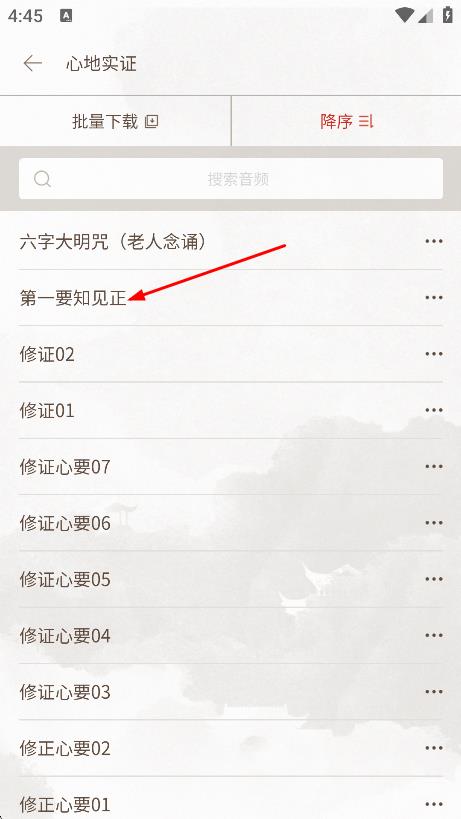 3、在心地实证音频列表页面,点击想要播放的音频。