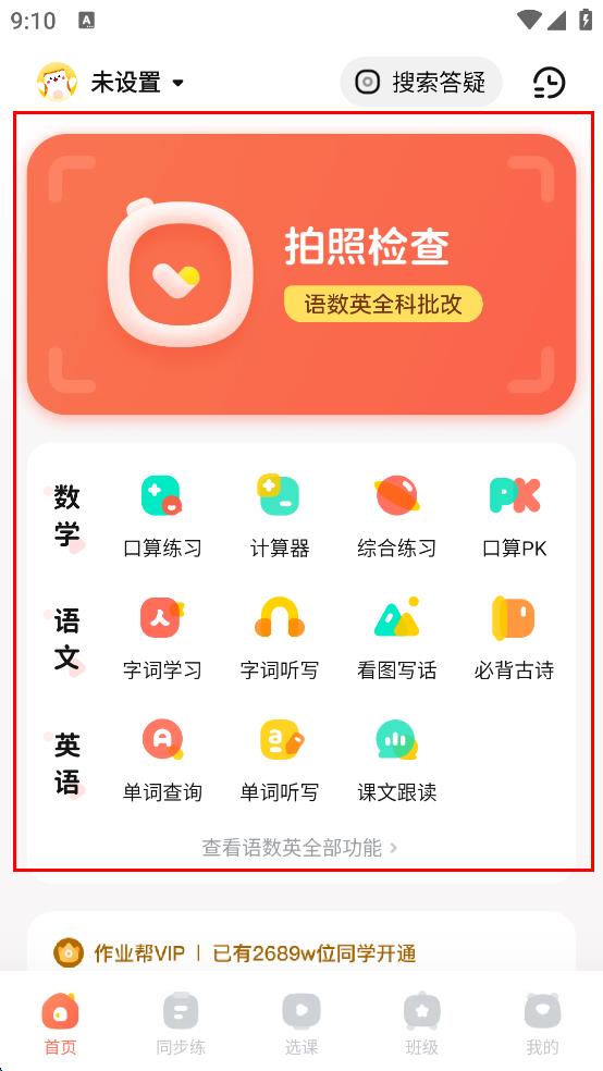 4、验证通过后,进入作业帮口算主界面,可使用“拍照检查”功能对语数英作业进行全科批改,也能选择数学、语文、英语学科下的各类学习功能进行学习。