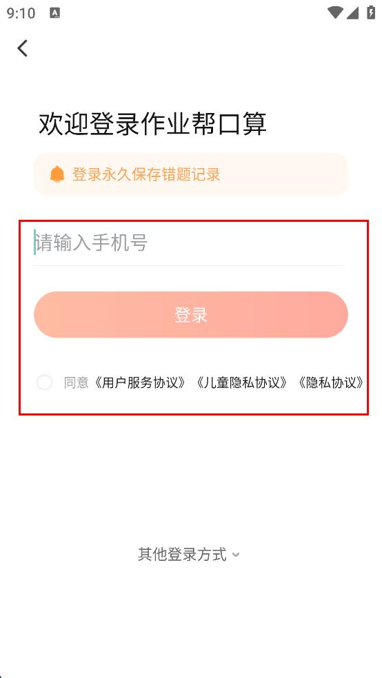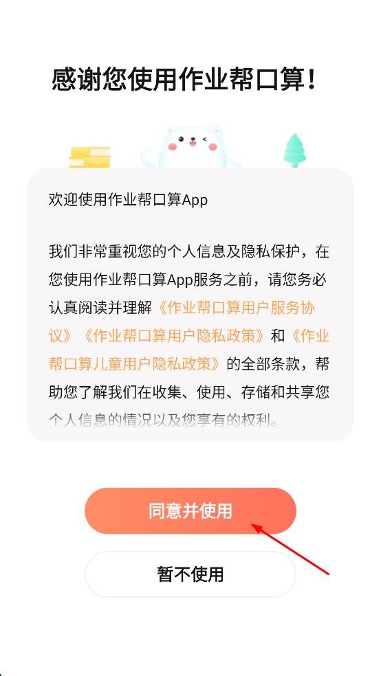 1、打开作业帮口算,进入初始页面后,点击“同意并使用”,进入登录界面。