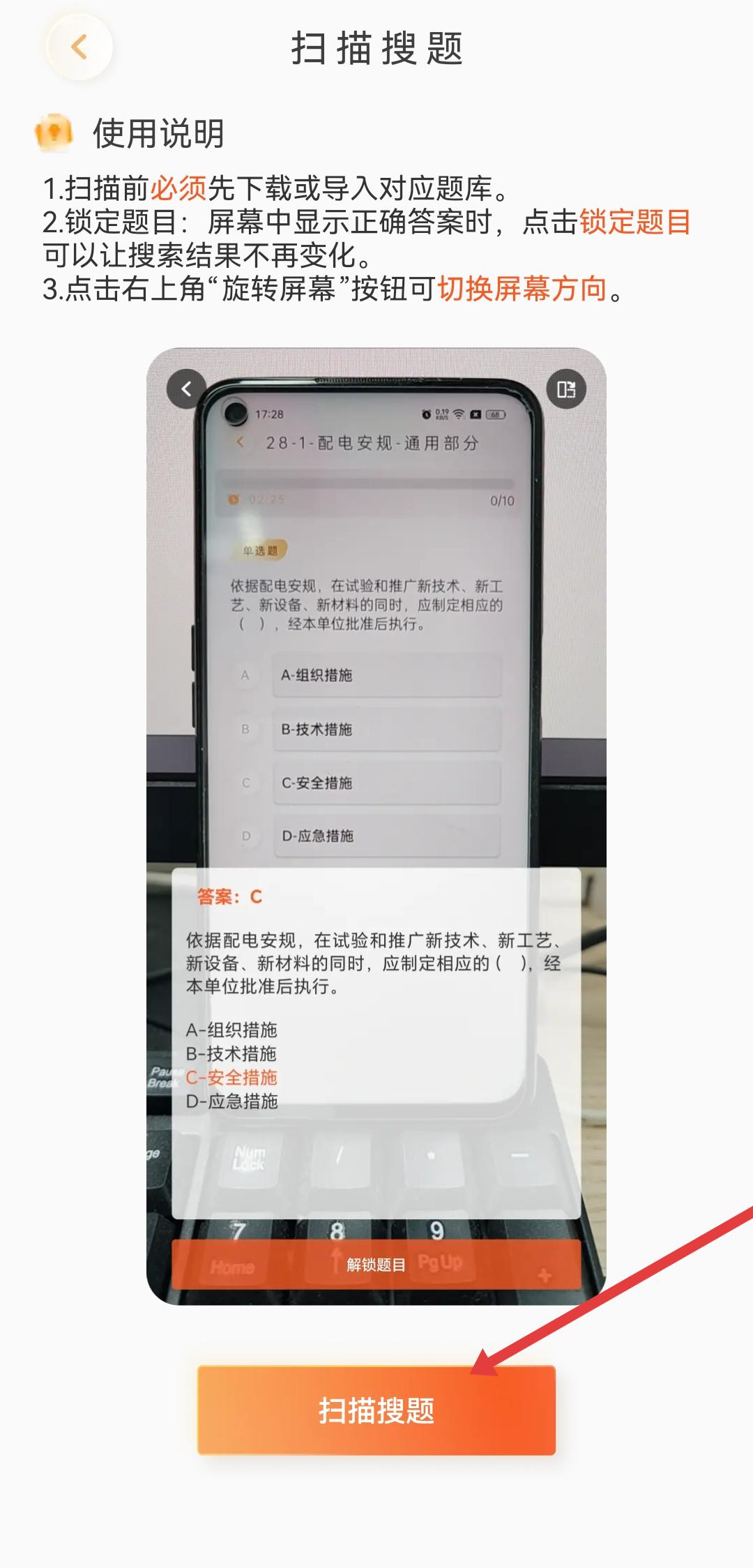 4、在扫描搜题页面,点击底部的扫描搜题按钮,即可开始搜索题目。