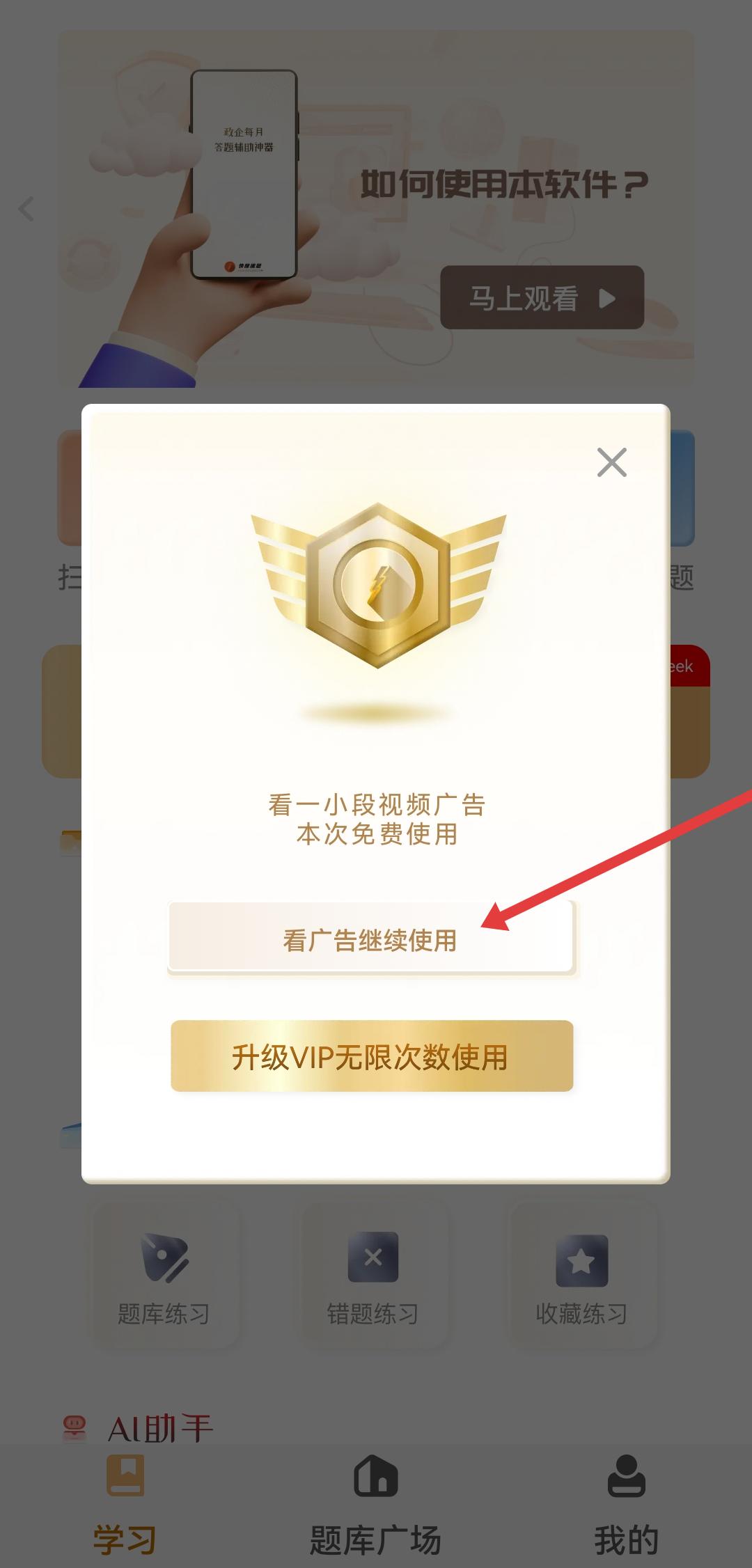 3、若出现广告提示框,点击看广告继续使用,完成广告观看以获取使用权限。