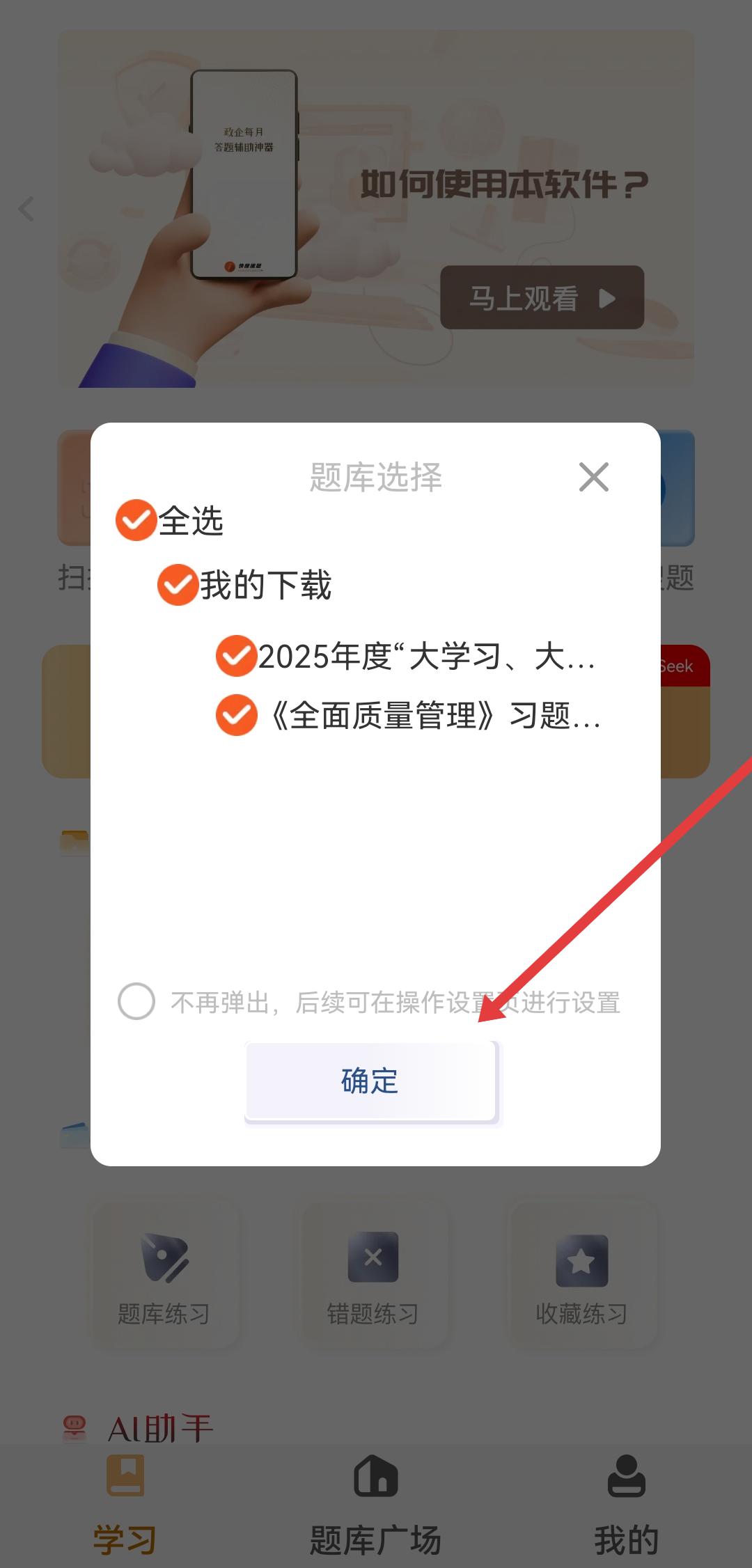2、在弹出的题库选择框中,需要确认所选题库后点击确定的按钮。
