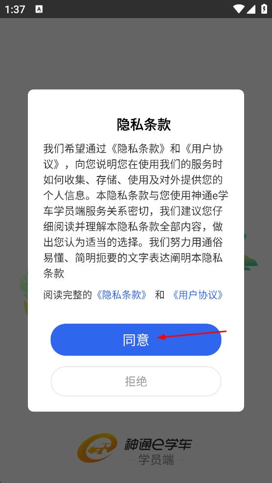 1、打开神通e学车,在弹出的隐私条款提示框中,点击“同意”,进入登录页面。