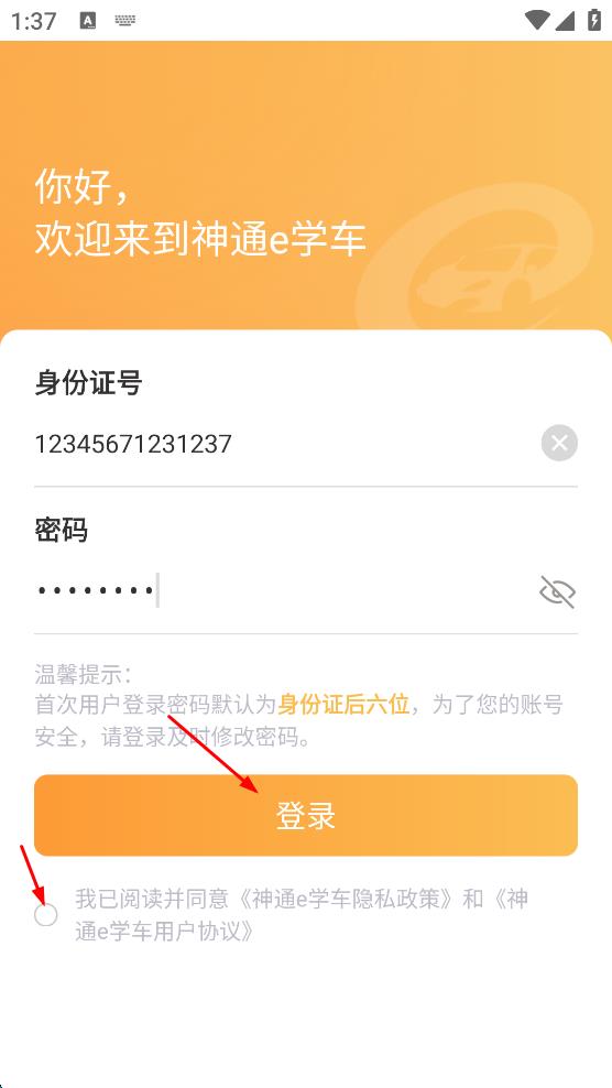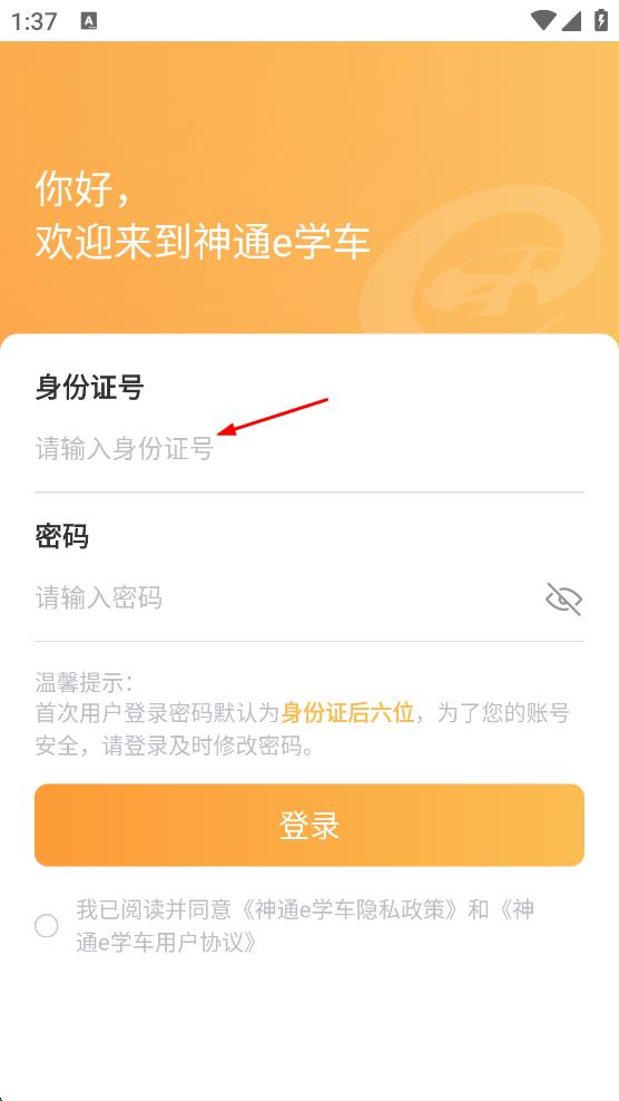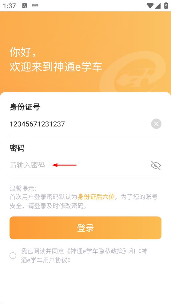 4、勾选我已阅读并同意神通e学车隐私政策和神通e学车用户协议,最后点击“登录”,即可完成神通e学车的登录。