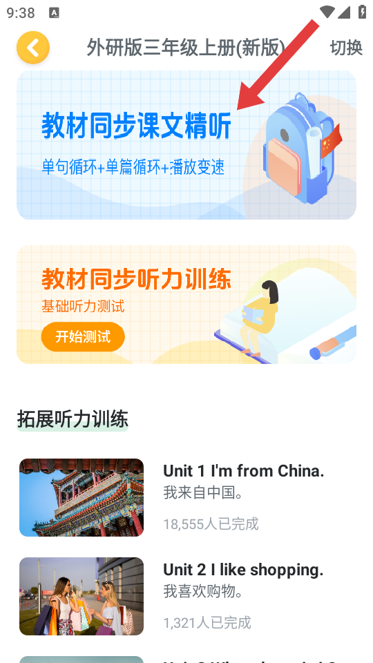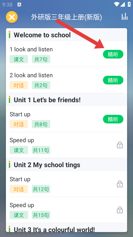 3、在教材精听选择页面,选择对应单元的精听,进入精听内容页面。