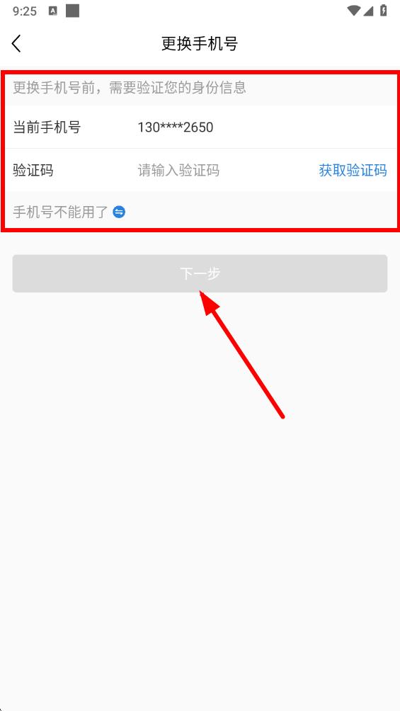 4、在弹出的更换手机号页面,先通过当前手机号获取验证码完成身份验证,然后点击下一步。