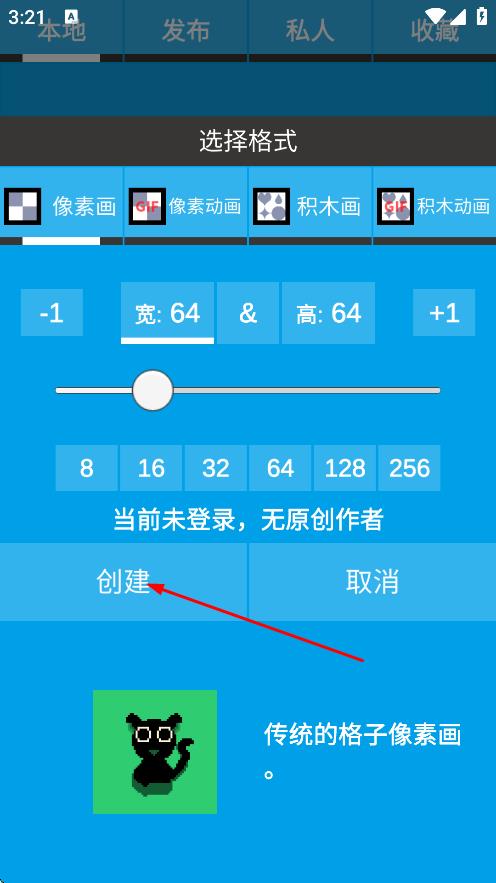 3、在创作编辑页面,可在网格上进行像素画创作。