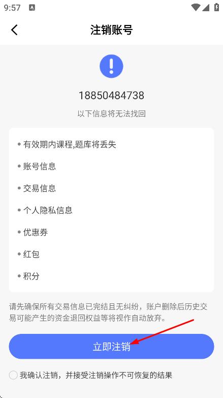 4、在注销账号确认页面,点击立即注销,可注销账号。