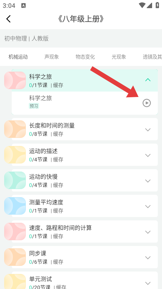 3、在章节列表页面,选择具体章节,点击播放按钮,进入课程详情页面。