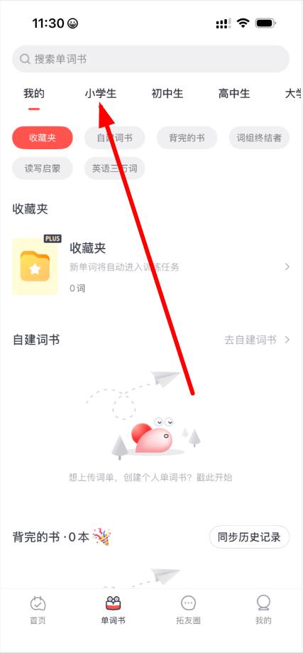 2、在单词书页面,点击小学生分类标签,切换到小学生单词书列表。