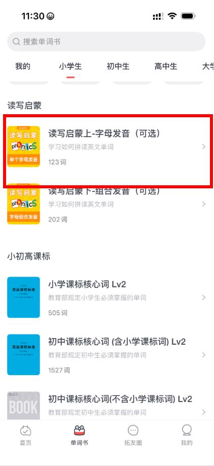 4、在读写启蒙分类下,选择读写启蒙上-字母发音可选等合适的单词书,即可完成选择。