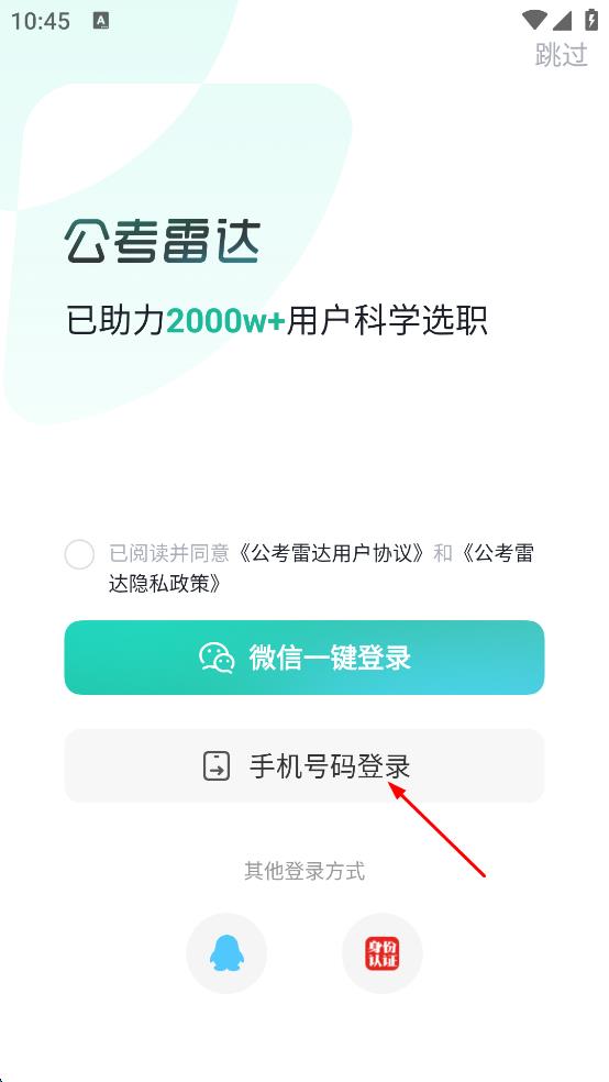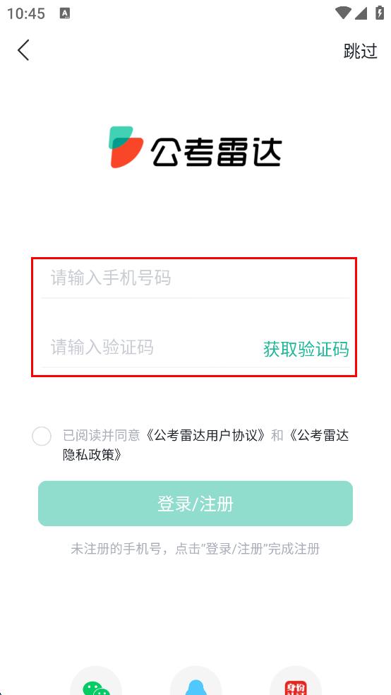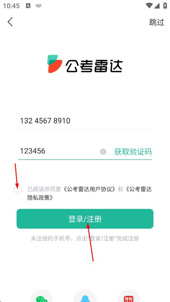 4、勾选已阅读并同意公考雷达用户协议和公考雷达隐私政策,最后点击“登录/注册”,即可完成注册或登录。