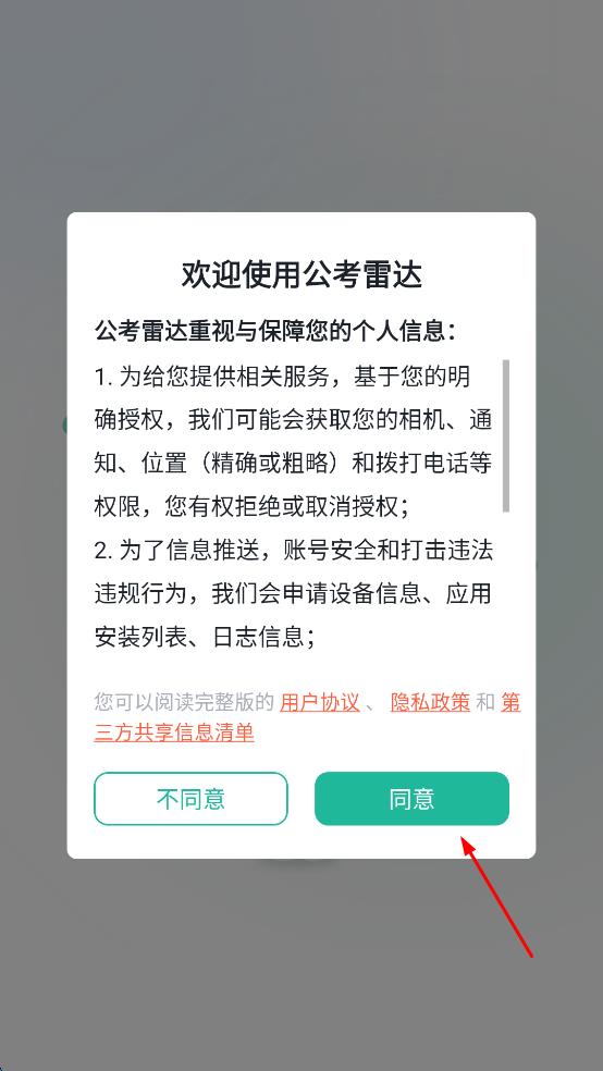1、打开公考雷达,在弹出的欢迎使用提示框中,仔细查看关于个人信息的相关说明后,点击“同意”。