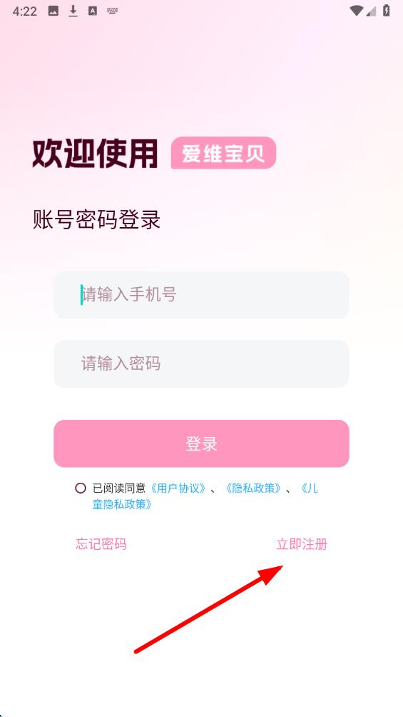 1、打开爱维宝贝app,在登录界面中点击右下角的立即注册选项进入注册页面。