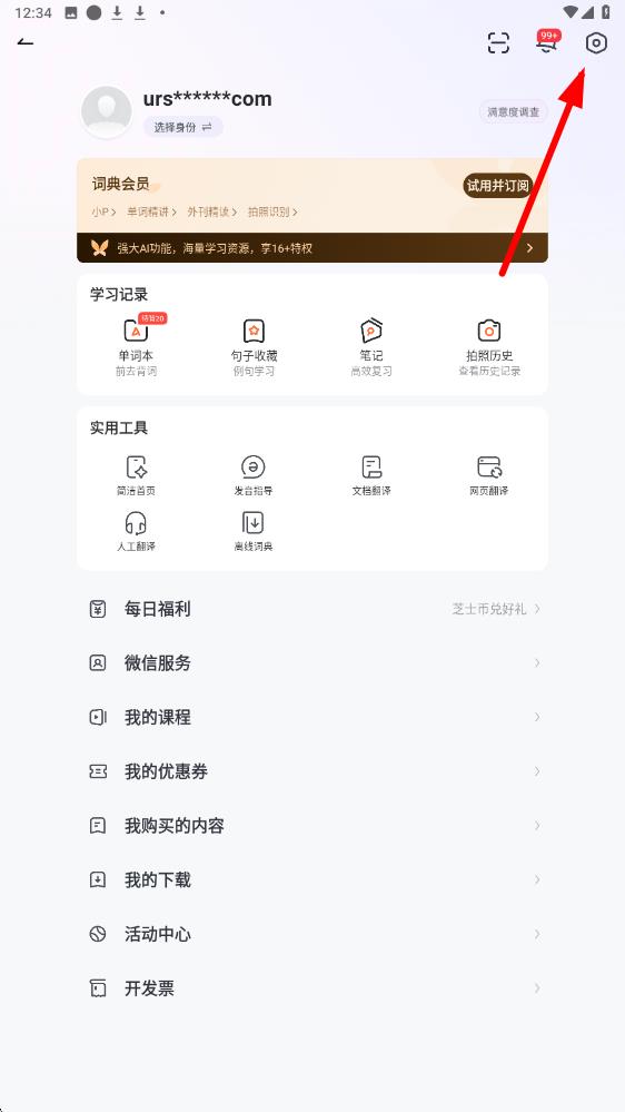 1、打开网易有道app,左上角头像进入个人页面,点击右上角设置图标进入设置界面。