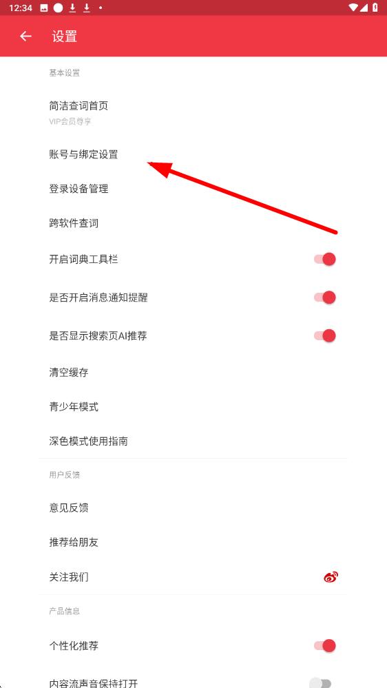 2、在设置界面中,找到账号与绑定设置选项,点击进入账号相关设置页面。