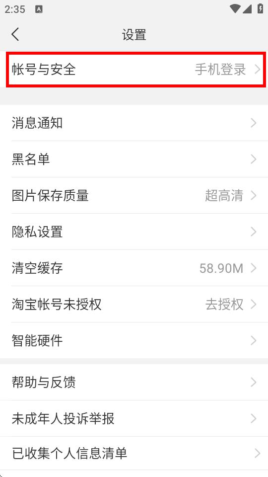 3、在设置界面,点击帐号与安全,进入帐号与安全页面。