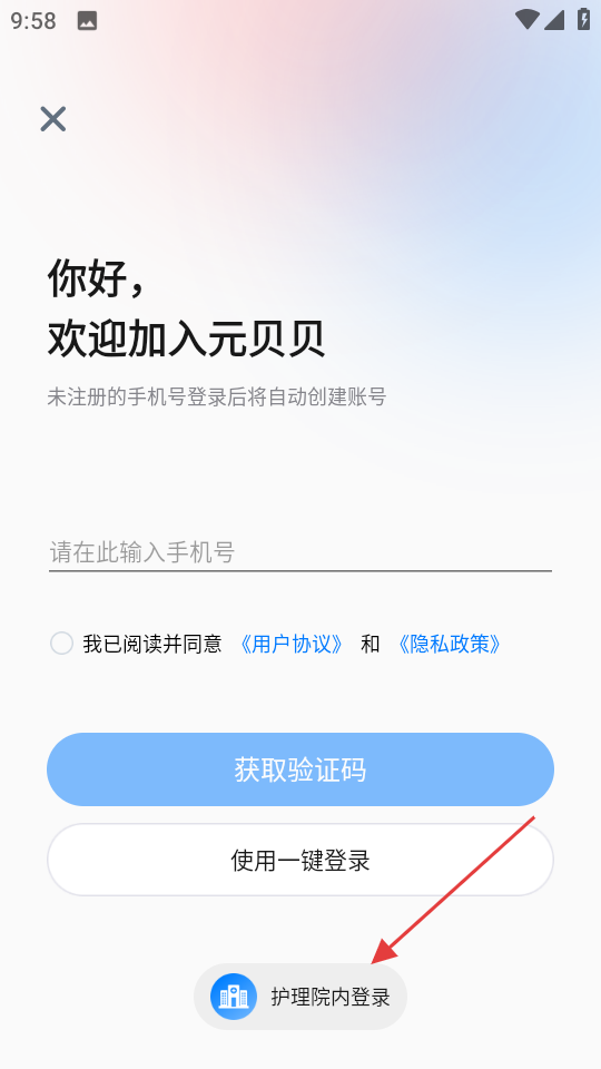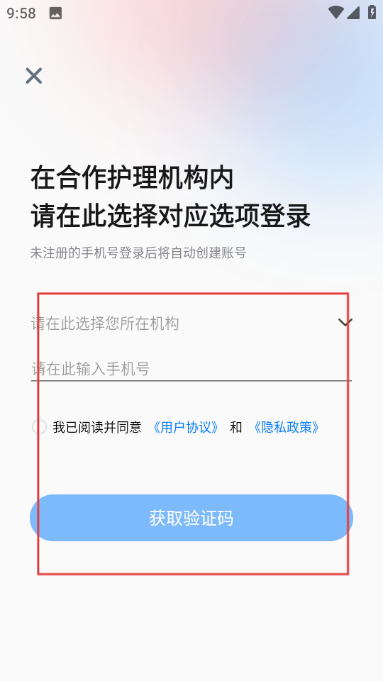 4、在护理院页面选择机构输入手机号并选同意,点击获取验证码完成登录。