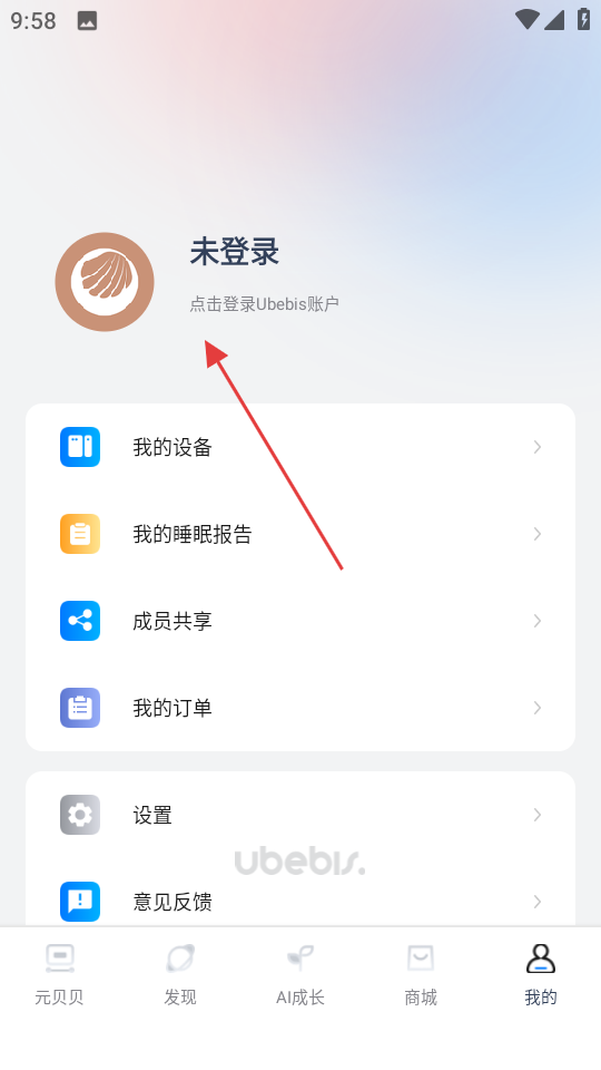 2、在个人页面,点击点击登录Ubebis账户,进入登录页面。