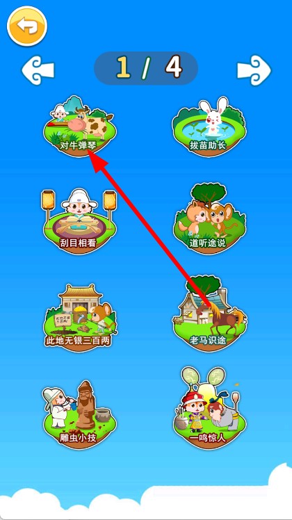 4、点击对牛弹琴选项,进入该成语故事的学习环节,聆听有声故事等内容。