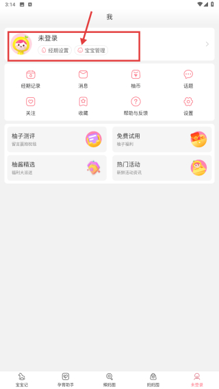 1、打开育儿记录应用,点击底部未登录选项,进入个人中心页面。